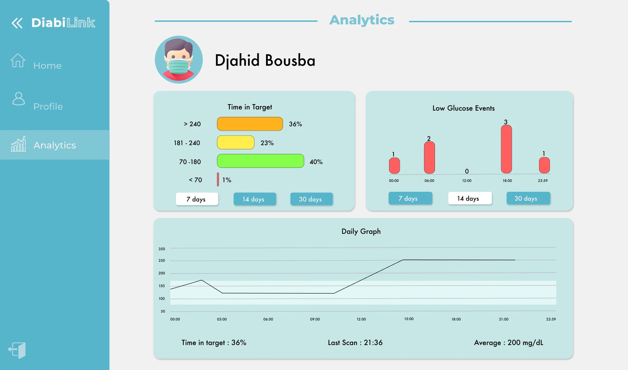 Diabilink is a collaborative e-health platform for diabetic patients. It centralizes medical data, displays real-time glycemic insights and securely shares information with doctors and family.